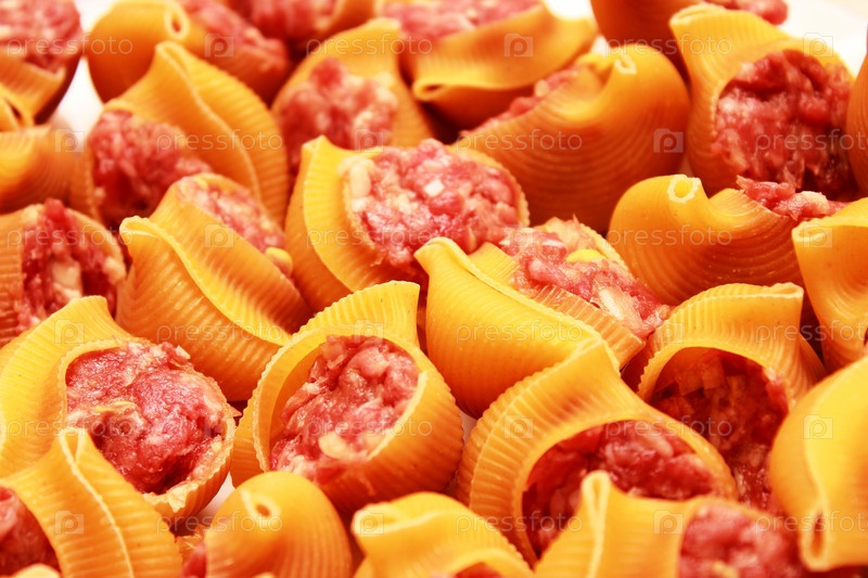 Сырые макароны с фаршем крупным планом