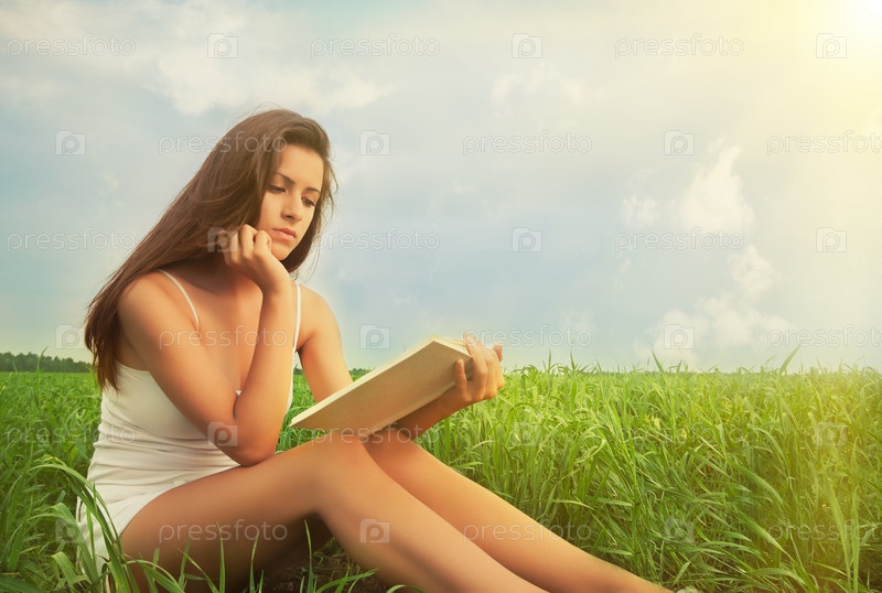 Красивая студентка читает книгу на лужайке в парке