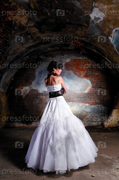 Молодая женщина в свадебном платье в заброшенном здании