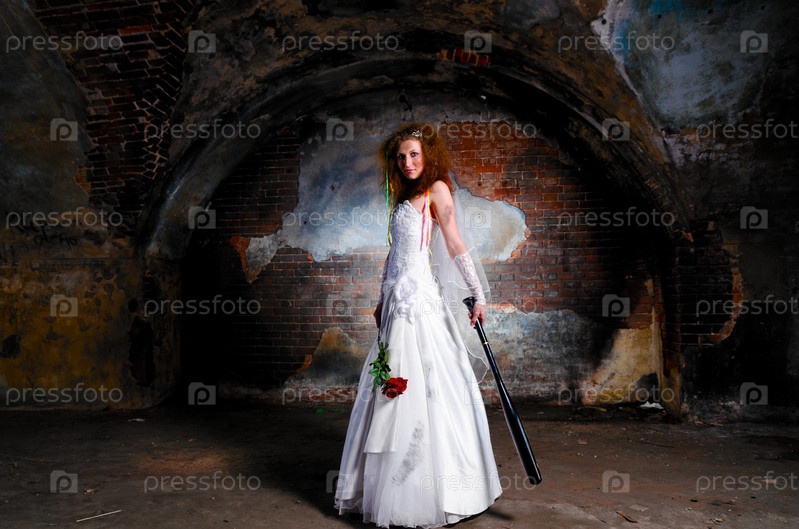 Молодая женщина в свадебном платье в заброшенном здании