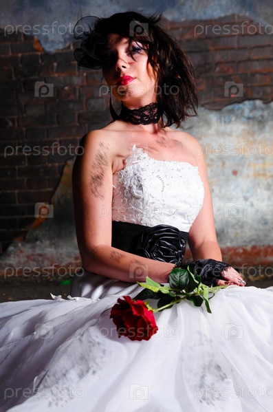 Молодая женщина в свадебном платье в заброшенном здании