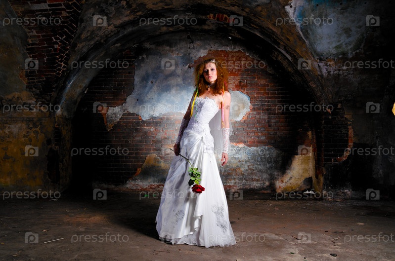 Молодая женщина в свадебном платье в заброшенном здании