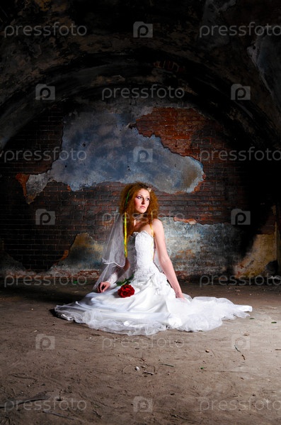 Молодая женщина в свадебном платье в заброшенном месте