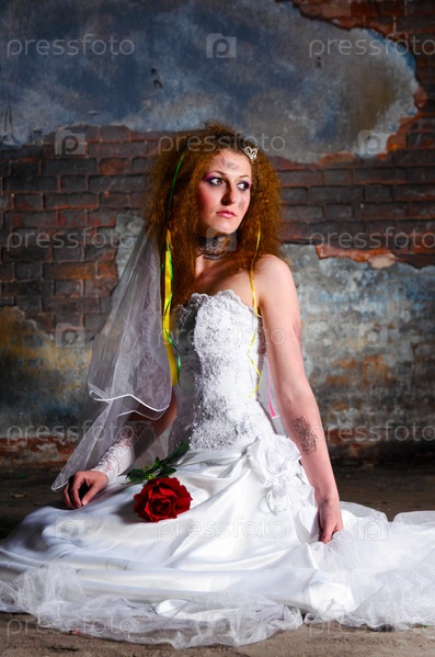 Молодая женщина в свадебном платье в заброшенном месте