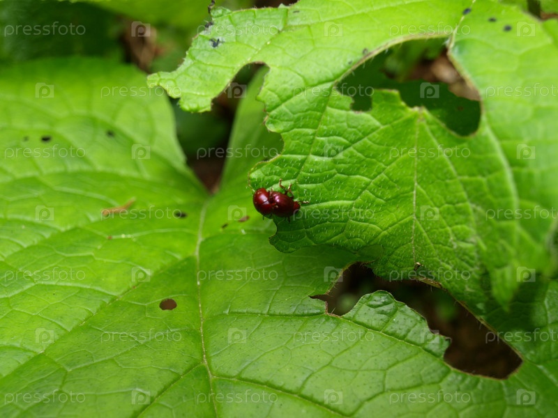 Два майских жука на листе лопуха