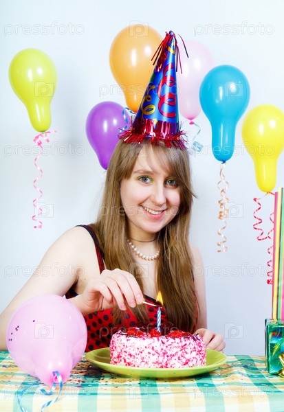 День рождения. Счастливая девушка зажигает свечу на торте