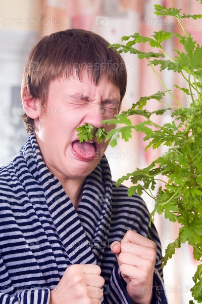 Подросток лечит насморк с помощью знаний народной медицины, нюхая герань