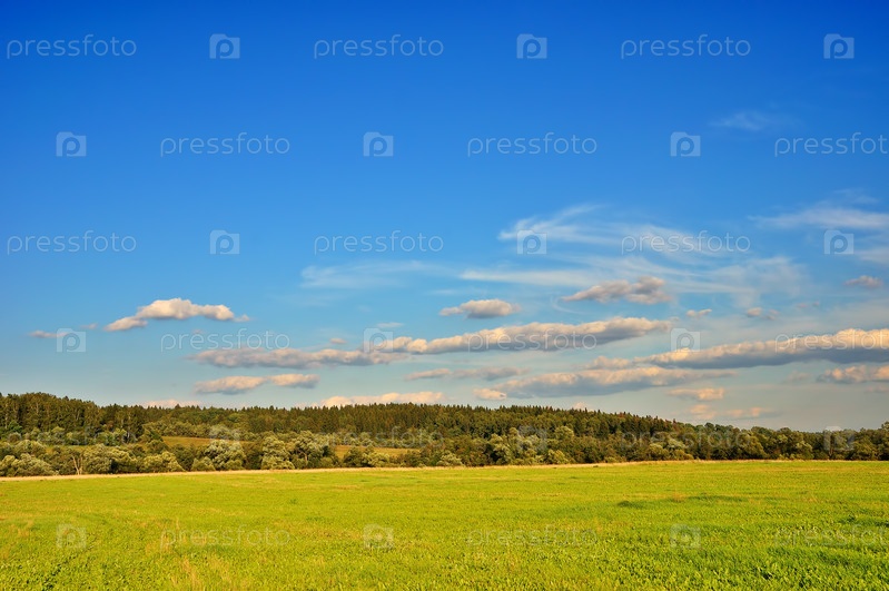 Летний сельский пейзаж с голубым облачным небом, зеленой травой и деревьями