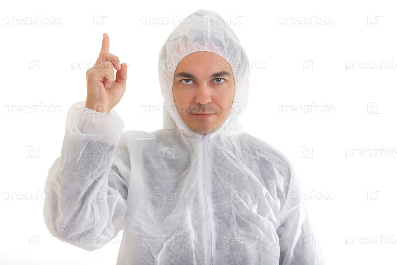 Мужчина в защитной одежде указывает вверх