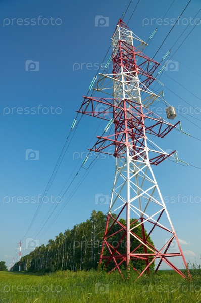 Опора линии электропередач на зеленом поле