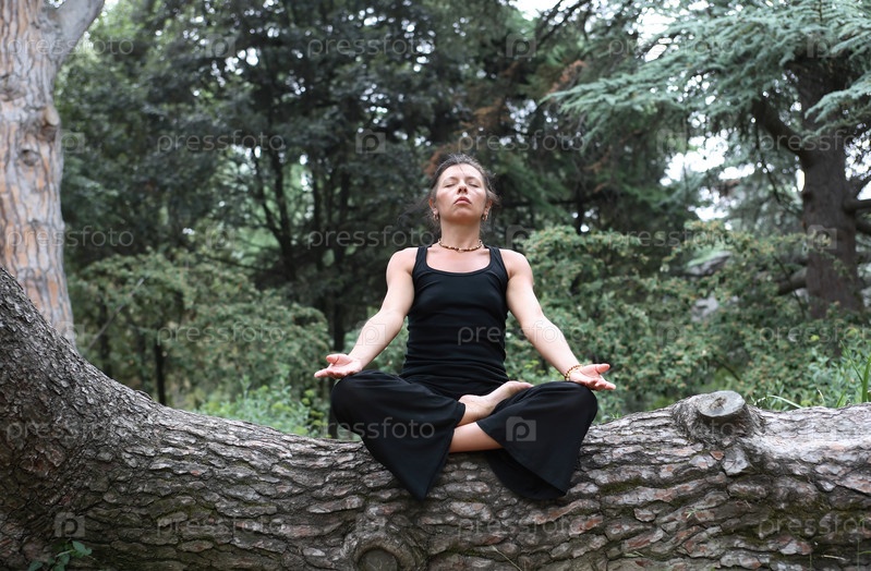 Стройная женщина в черном сидит в позе лотоса на фоне леса