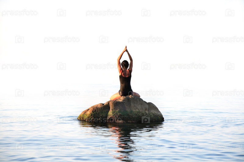 Стройная женщина занимается йогой на камне в море