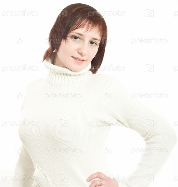Красивая женщина в белом свитере на белом фоне