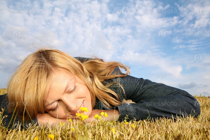 Молодая женщина лежит на траве