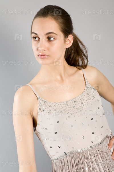 Портрет девушки с длинными волосами в элегантном платье на сером фоне