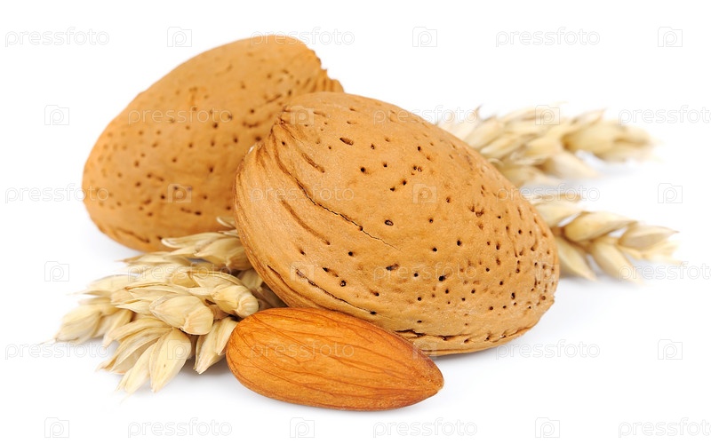 Миндаль и пшеница на белом фонекрупным планом