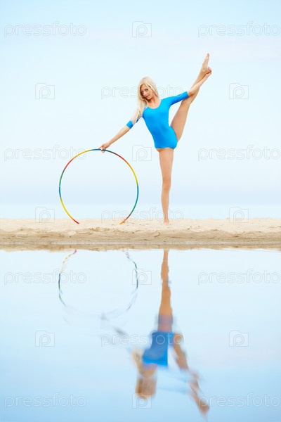 Портрет молодой красивой блондинки, занимающейся гимнастикой с обручем на песке