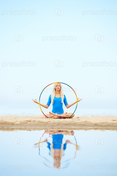 Портрет молодой красивой блондинки, занимающейся гимнастикой с обручем на песке