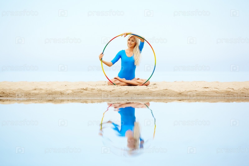 Портрет молодой красивой блондинки, занимающейся гимнастикой с обручем на песке