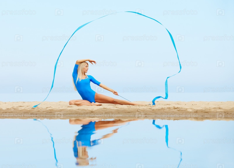 Портрет молодой красивой блондинки, занимающейся гимнастикой с лентой на песке