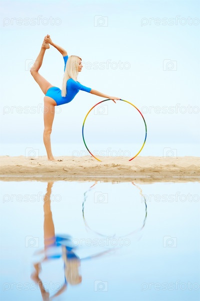 Красивая гимнастка с хула-хупом на песке