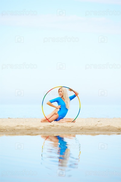 Красивая гимнастка с хула-хупом на песке