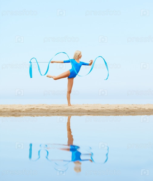 Красивая гимнастка с лентой на пляже