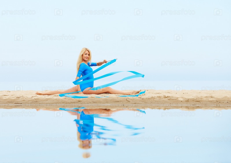 Красивая гимнастка с лентой на пляже