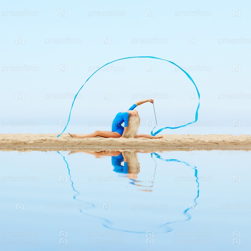 Красивая гимнастка с лентой на пляже
