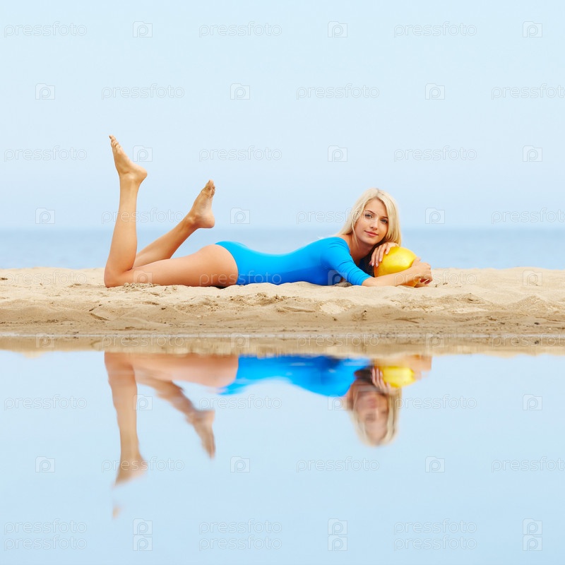 Красивая гимнастка с мячом на пляже