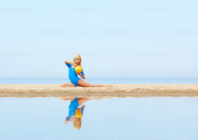 Красивая гимнастка с мячом на пляже