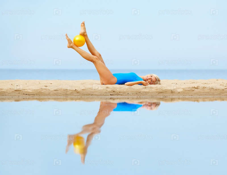 Красивая гимнастка с мячом на пляже