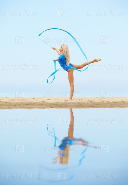 Красивая гимнастка с лентой на пляже