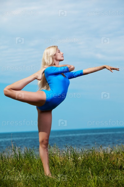 Молодая красивая гимнастка на зеленой траве