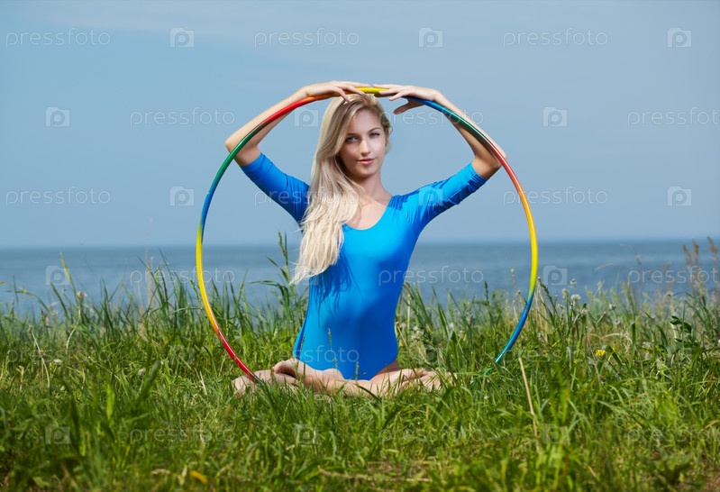 Молодая красивая гимнастка на зеленой траве