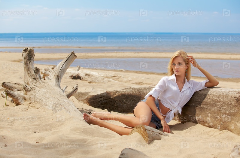 Молодая красивая блондинка отдыхает на пляже