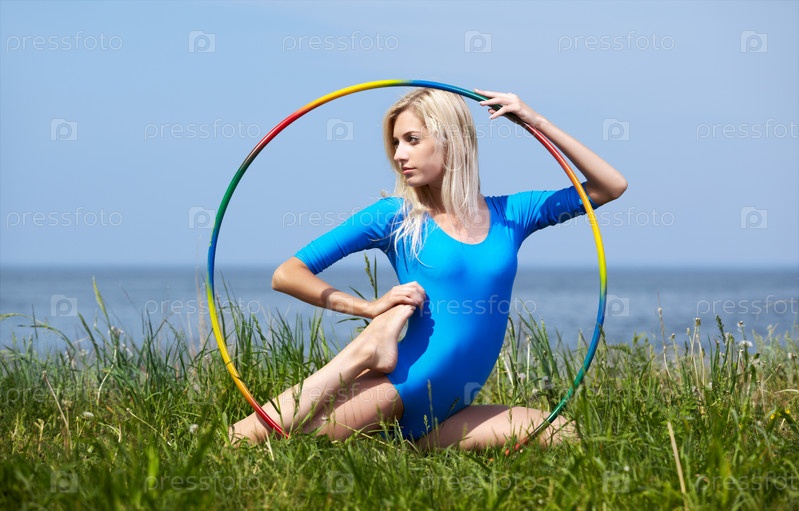 Молодая красивая гимнастка на зеленой траве