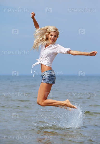 Молодая красивая блондинка прыгает в волнах