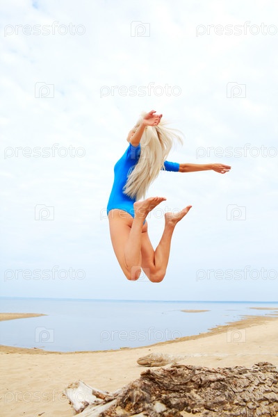Портрет молодой красивой белокурой гимнастки, прыгающей на пляже