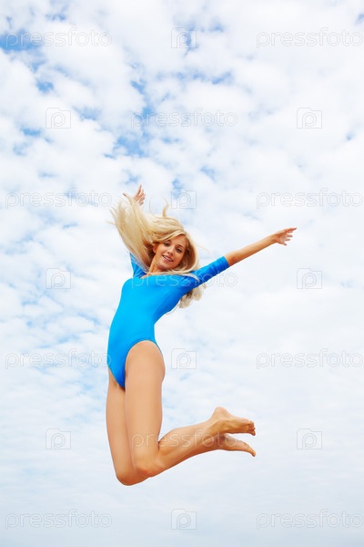 Портрет молодой красивой белокурой гимнастки, прыгающей на фоне неба