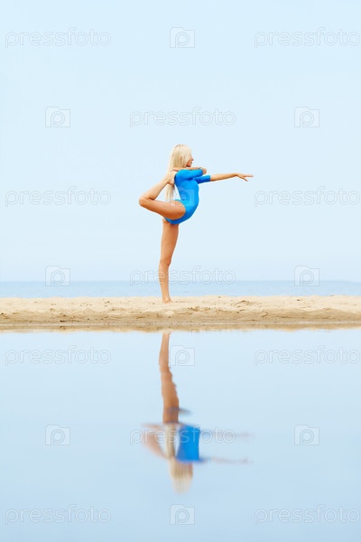 Портрет молодой красивой белокурой гимнастки, тренирующейся на пляже