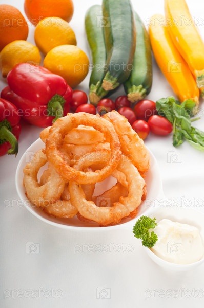 Жареный лук кольцами и свежие овощи