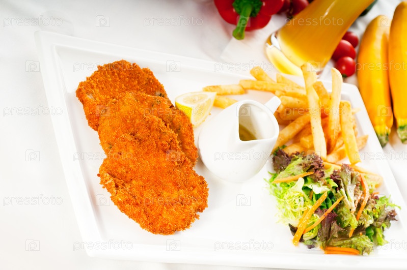 Миланские телячьи котлеты с картошкой фри, овощи и светлое пиво
