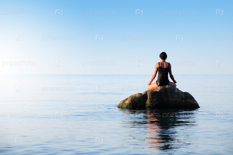 Стройная женщина занимается йогой на большом камне в море