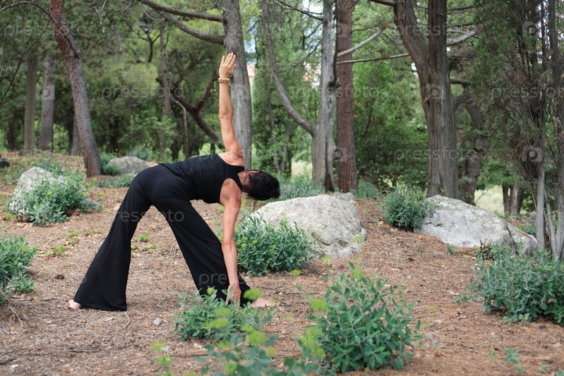 Стройная взрослая женщина в черном занимается йогой среди камней в лесу