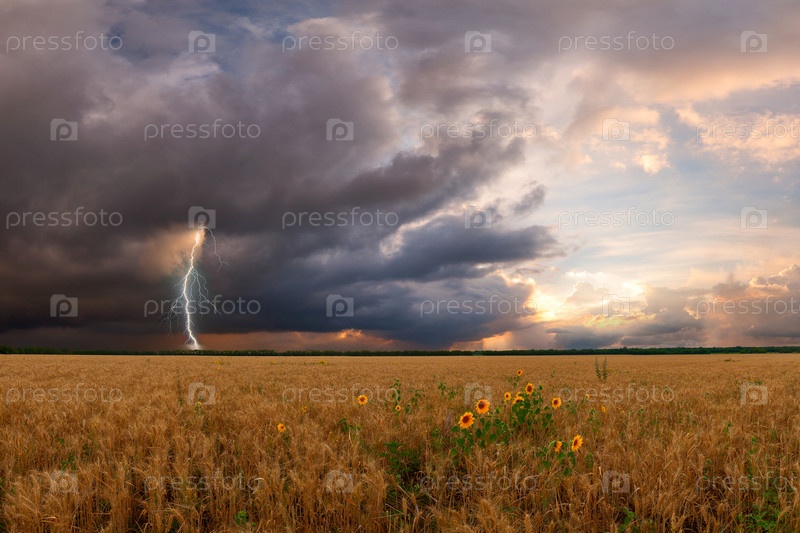 Летний пейзаж с пшеницей и подсолнечниками на поле и молнией на заднем плане