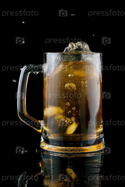 Кусок льда в холодном пиве на черном фоне