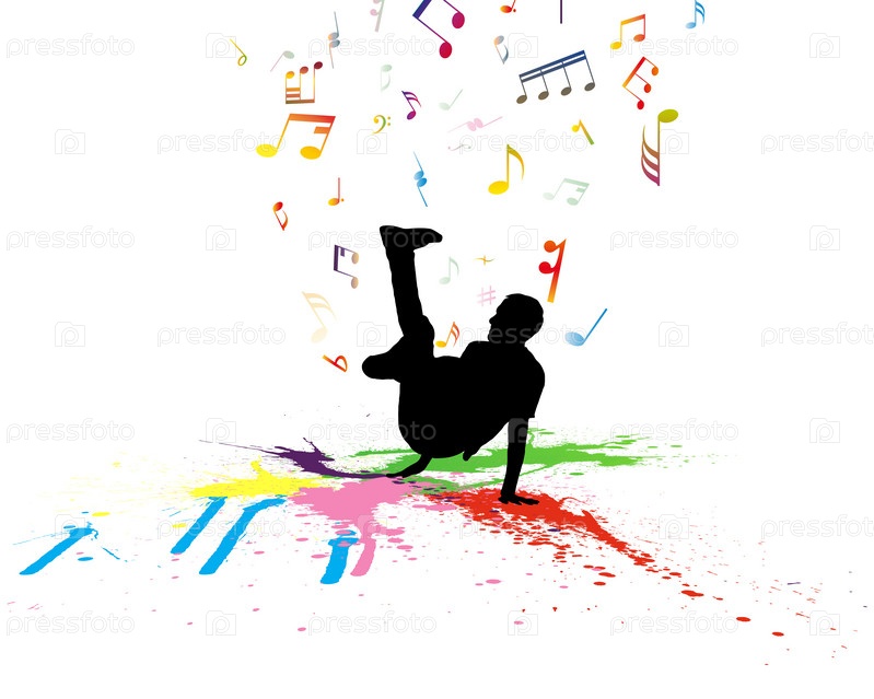 Танцор на гранжевом фоне с нотами. Векторная иллюстрация