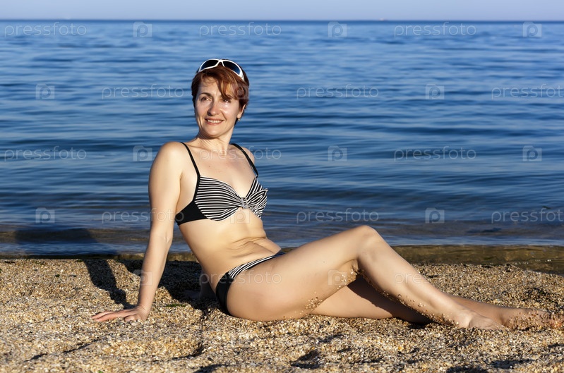 Стройная женщина загорает на пляже и улыбается