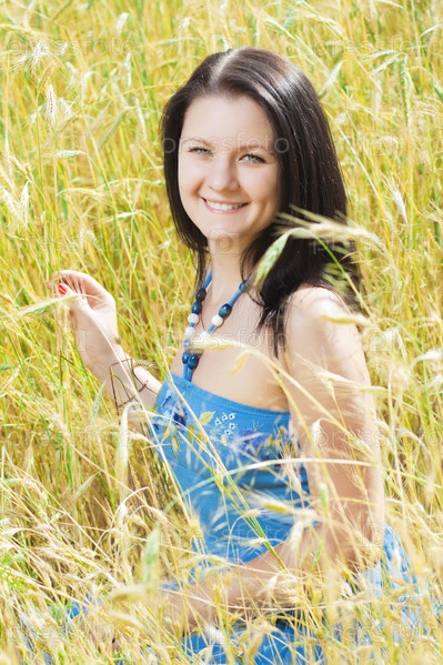Молодая улыбающаяся женщина стоит в поле